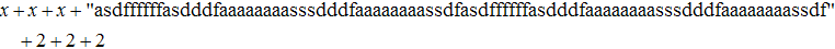 <math xmlns="http://www.w3.org/1998/Math/MathML" display="block"> <mrow> <mi>x</mi> <mo>+</mo> <mi>x</mi> <mo>+</mo> <mi>x</mi> <mo>+</mo> <ms>asdffffffasdddfaaaaaaaasssdddfaaaaaaaassdfasdffffffasdddfaaaaaaaasssdddfaaaaaaaassdf</ms> <mo>+</mo> <mn>2</mn> <mo>+</mo> <mn>2</mn> <mo>+</mo> <mn>2</mn> </mrow> </math>